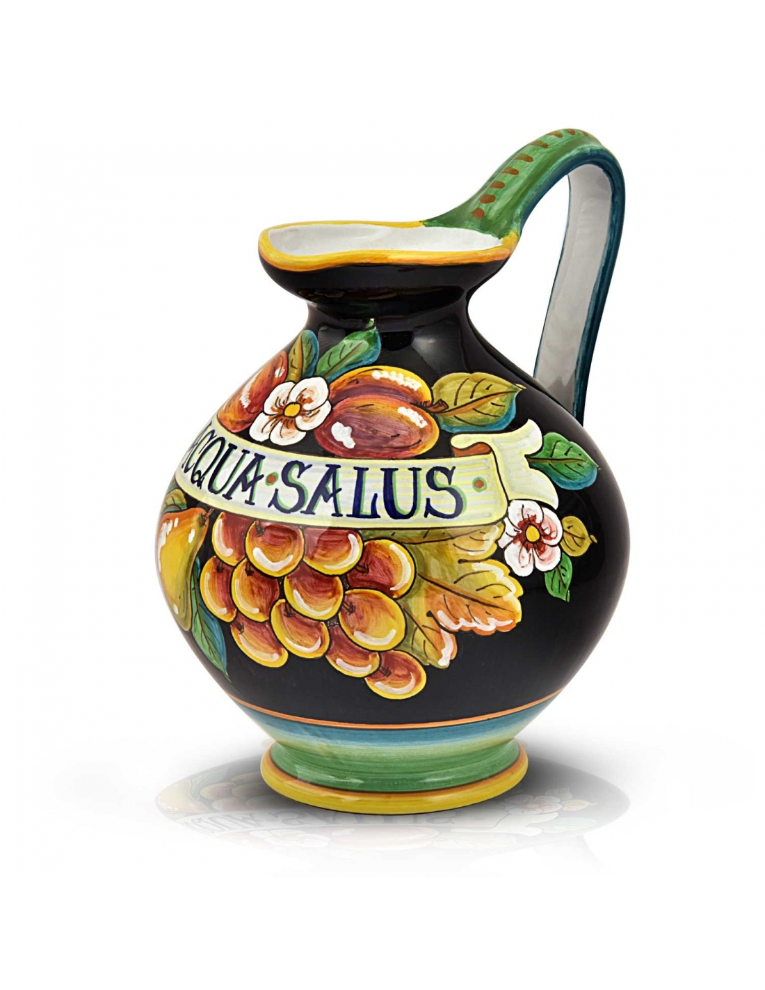 Brocca dalla capacità di 2 Lt. adatta per essere utilizzata in tutti i momenti della giornata, dalla mattina per contenere latte o spremuta per una colazione sprint, alla merenda dei bambini per una bevanda sfiziosa, fino alla sera per decantare un buon vino che accompagni un pasto gustoso. Il cartiglio "In acqua salus"significa "Salute per mezzo dell'acqua"
