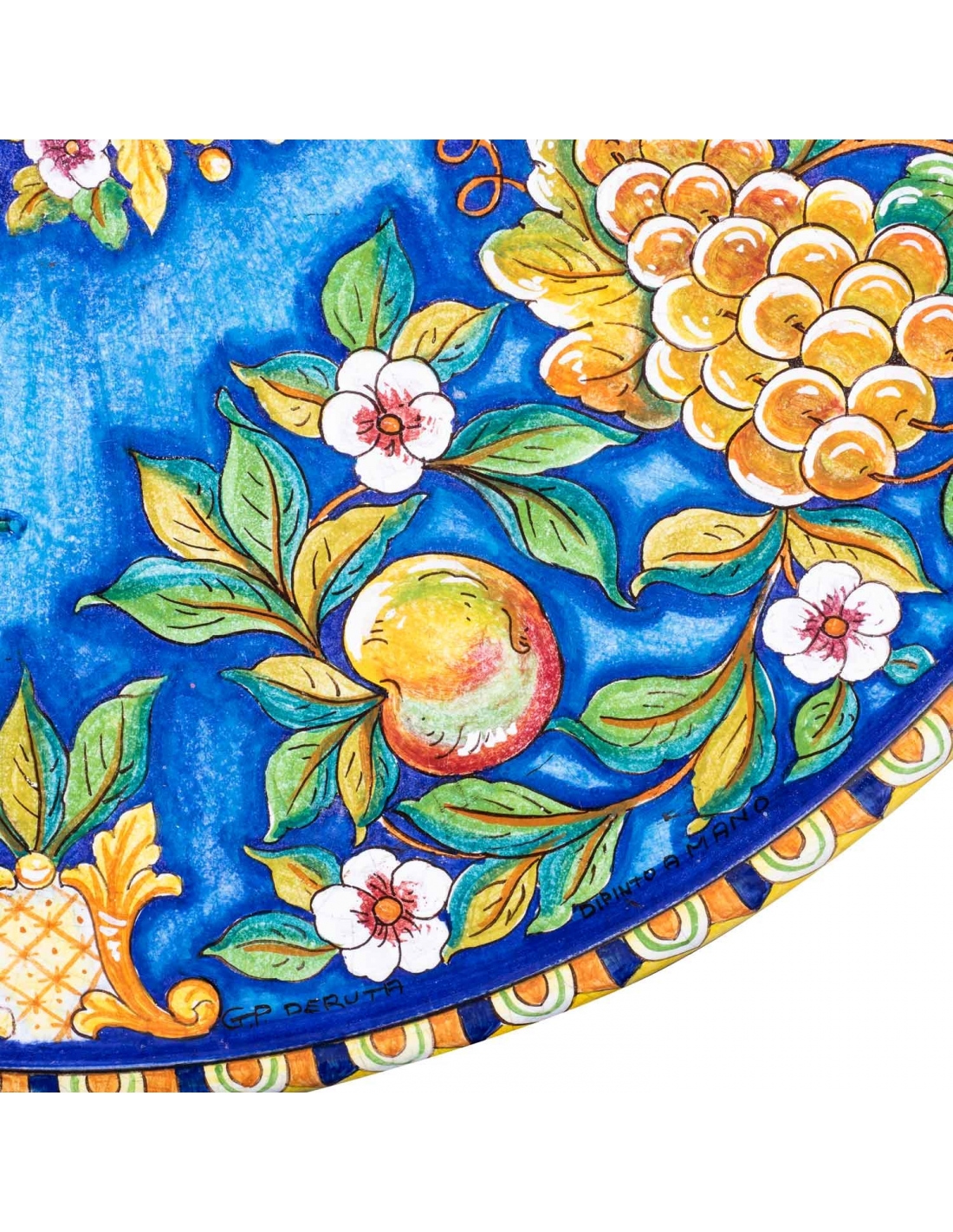 Il fondo azzurro che sfuma nel turchese e la varietà di colori della nostra Frutta donano freschezza ed allegria al nostro tavolo rotondo e lo rendono di una eleganza unica e particolare. Il suo stile, classico e dal sapore artigianale, lo rende adatto a portare un tocco di appassionata energia al tuo giardino, al tuo terrazzo o al tuo pergolato, per uno stile unico e particolare. Il piano, del diametro di 70 cm. è in pietra peperino majolicata mentre la base, alta 75 cm. è in ferro battuto, zincato e forgiato a mano seguendo tradizionali tecniche artigianali. Resiste perfettamente a qualsiasi tipo di agente atmosferico; né il sole, la salsedine, la pioggia od il gelo possono provocare danneggiamenti.