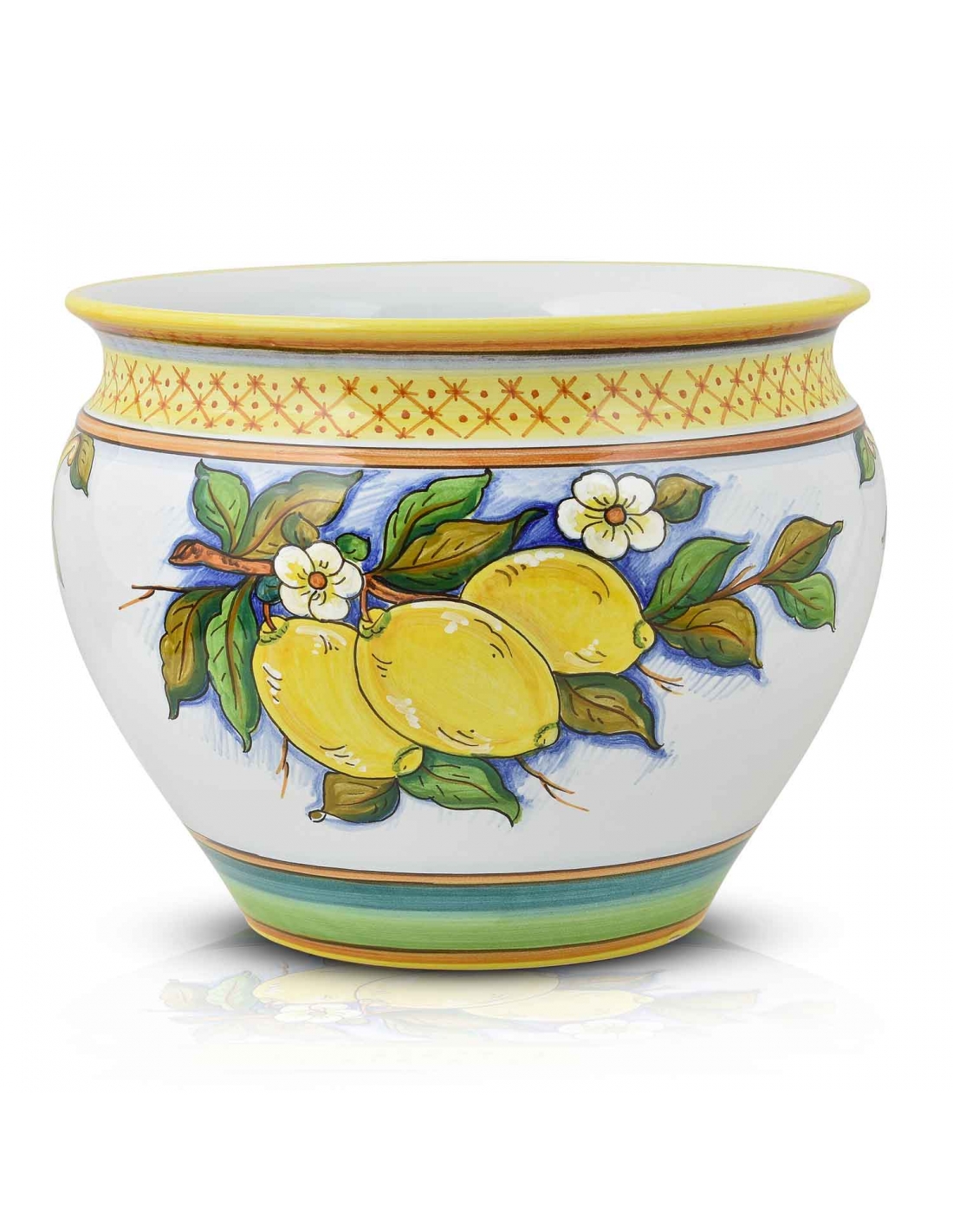 Porta pianta con il giallo dei suoi limoni dona brio ed allegria ad ogni angolo della tua casa. Può essere posizionato in terra ma anche su di un tavolo diventa un elegante elemento di arredo e in estate potrà accompagnare le tue piante da interno nel tuo terrazzo o nel tuo giardino.